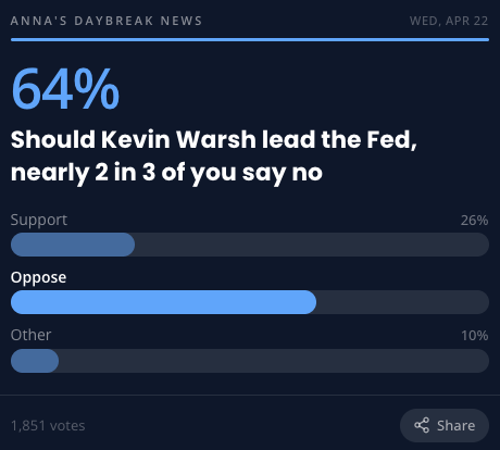 Click here to read the poll results and comments from our previous edition. Over 3,736 people gave their opinion about Kevin Warsh leading the Fed and more.
