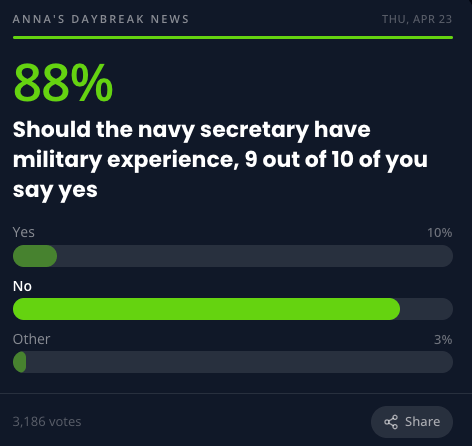 Click here to read the poll results and comments from our previous edition. Over 4,952 people gave their opinion about becoming a Navy Secretary and more.