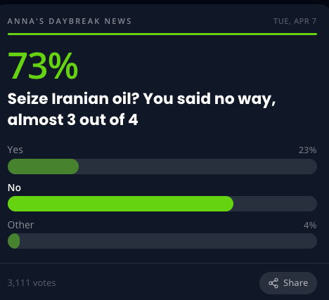 Click here to read the poll results and comments from our previous edition. Over 4,243 people gave their opinion about plans to seize Iran’s oil and more.