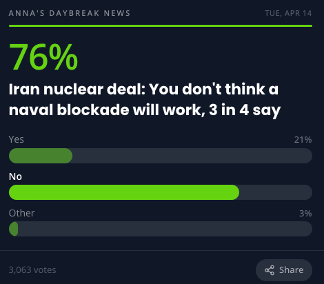 Click here to read the poll results and comments from our previous edition. Over 4,923 people gave their opinion about the effectiveness of the Hormuz naval blockade to pressure Iran and more.